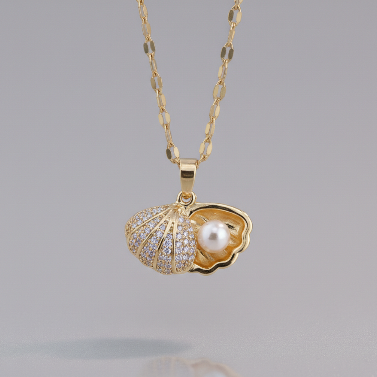 Crafted with a sculpted clam shell locket, this pendant represents a hidden pearl—something rare, beautiful, and worth holding close. Delicate crystal accents catch the light for a soft, flattering glow.