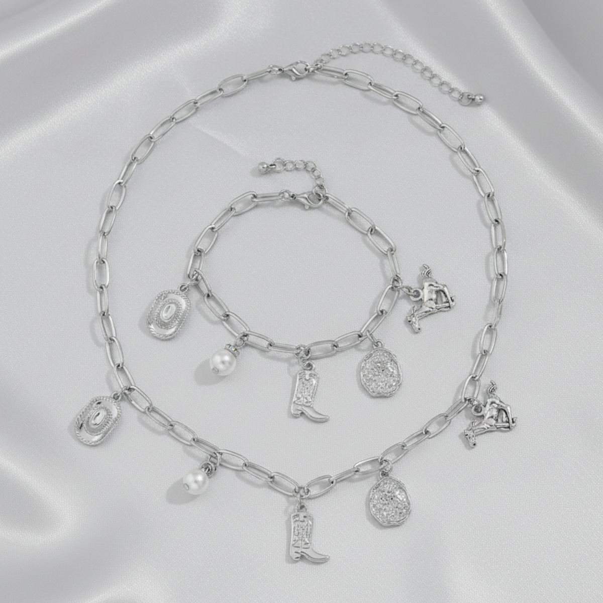 Crafted from a bold link chain with a sleek clasp, this necklace channels western spirit. Boots, hats, and medallions swing with every move, catching the light effortlessly.