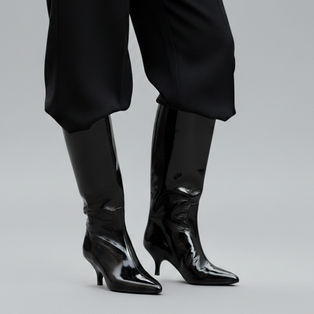 Crafted from man-made leather, these boots have a sleek impression with a smooth, glossy finish. The pointed toe sharpens the front profile, while the slim heel adds lift with a narrow base.