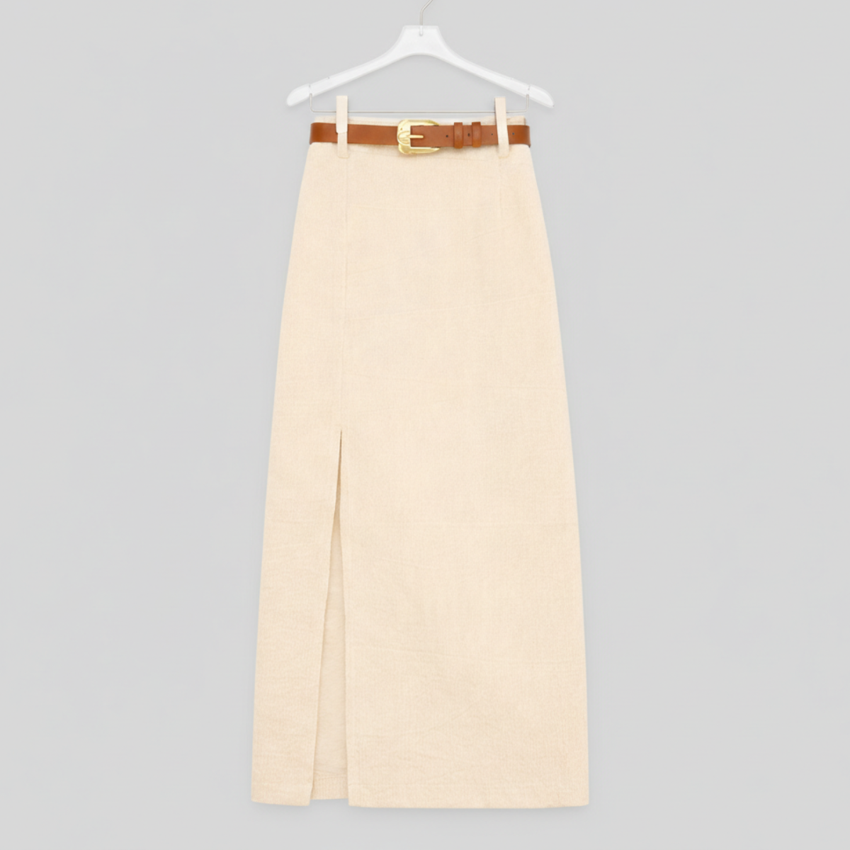Crafted from soft ribbed corduroy, this skirt has a smooth, velvety feel with a vintage-inspired look. The long straight shape pairs beautifully with sweaters, blouses, or fitted knits, while the gold-buckle belt cinches the waist for a perfect fit.