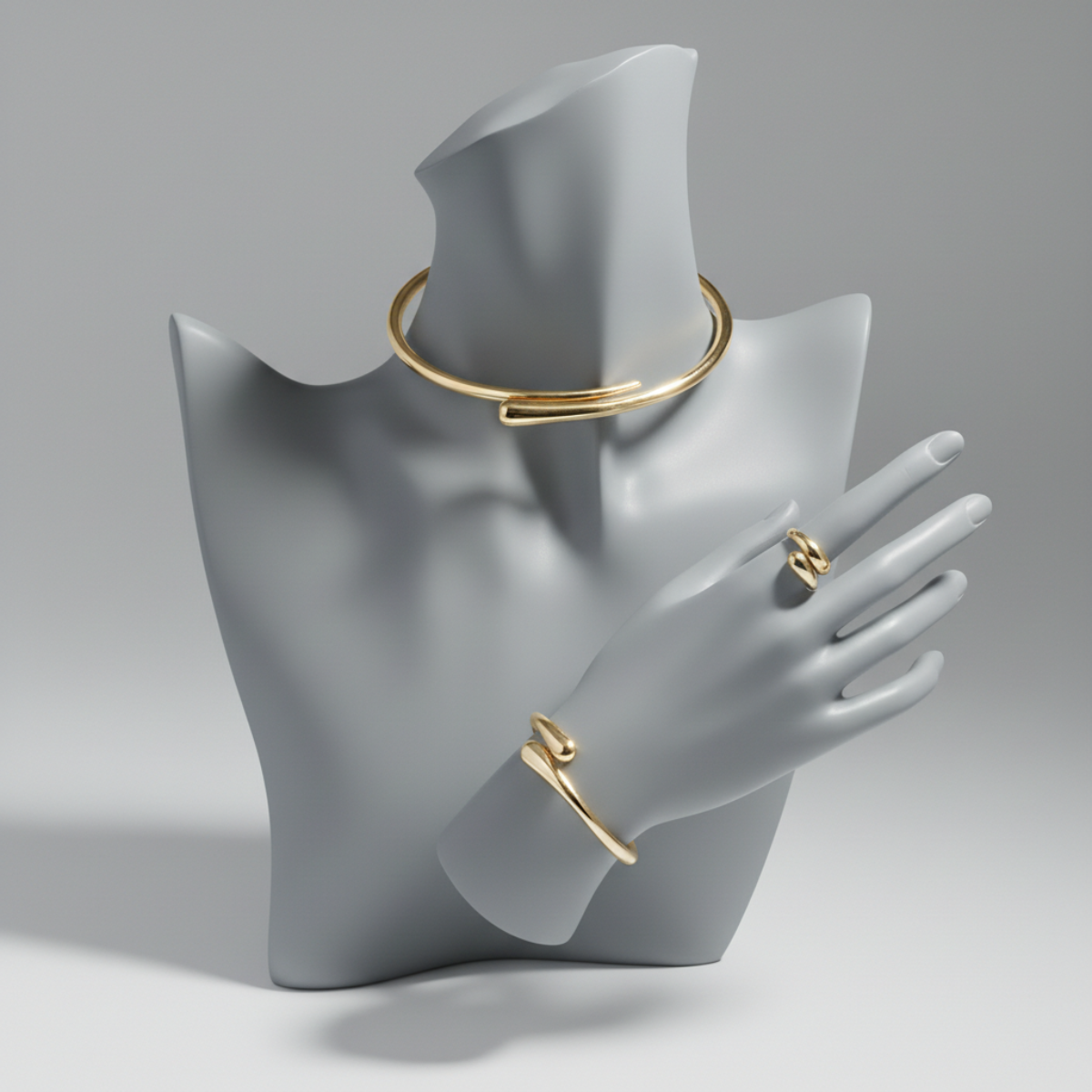 Crafted from gold-tone alloy, this three-piece set adds a warm, polished touch to any look. The smooth collar flatters the neckline, while the open cuff and rounded ring bring a timeless shine you’ll enjoy wearing again and again.