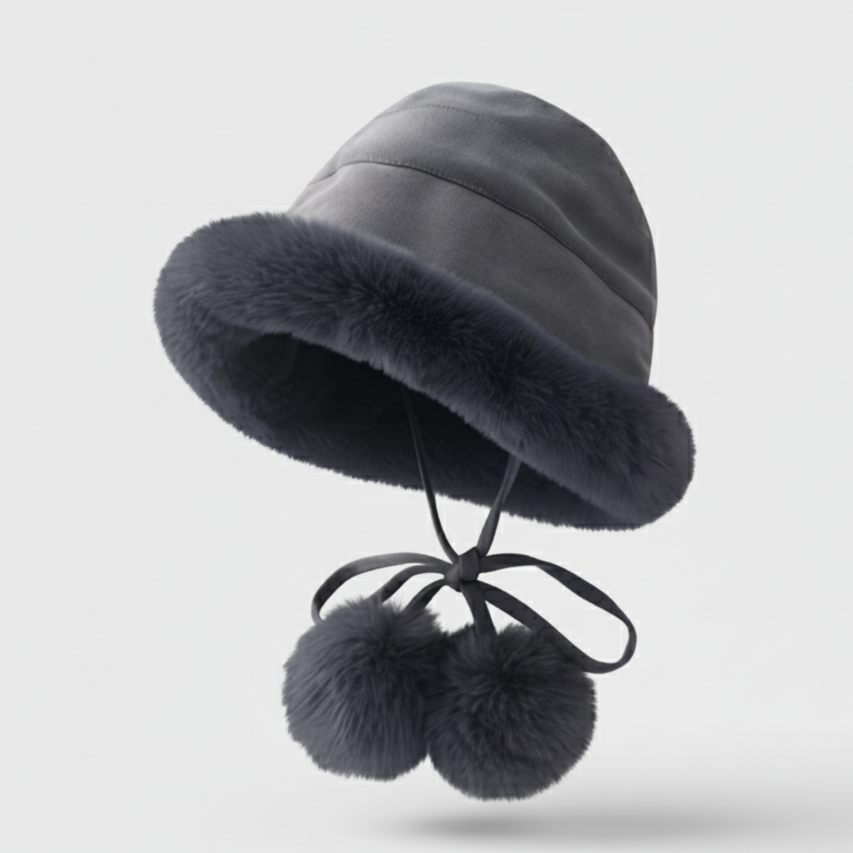 Crafted from a smooth, padded fabric with a plush faux-fur brim, this bucket hat wraps you in cozy warmth with a soft, cloud-like feel. The tie-under chin straps keep it secure, finished with fluffy fur-ball accents for a sweet detail.
